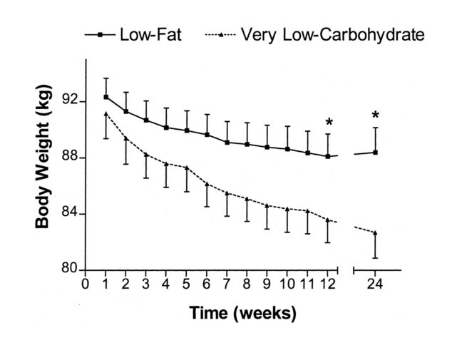 El siguiente gráfico es de un estudio en el que las mujeres con sobrepeso realizaron y compararon dietas bajas en carbohidratos y grasas.